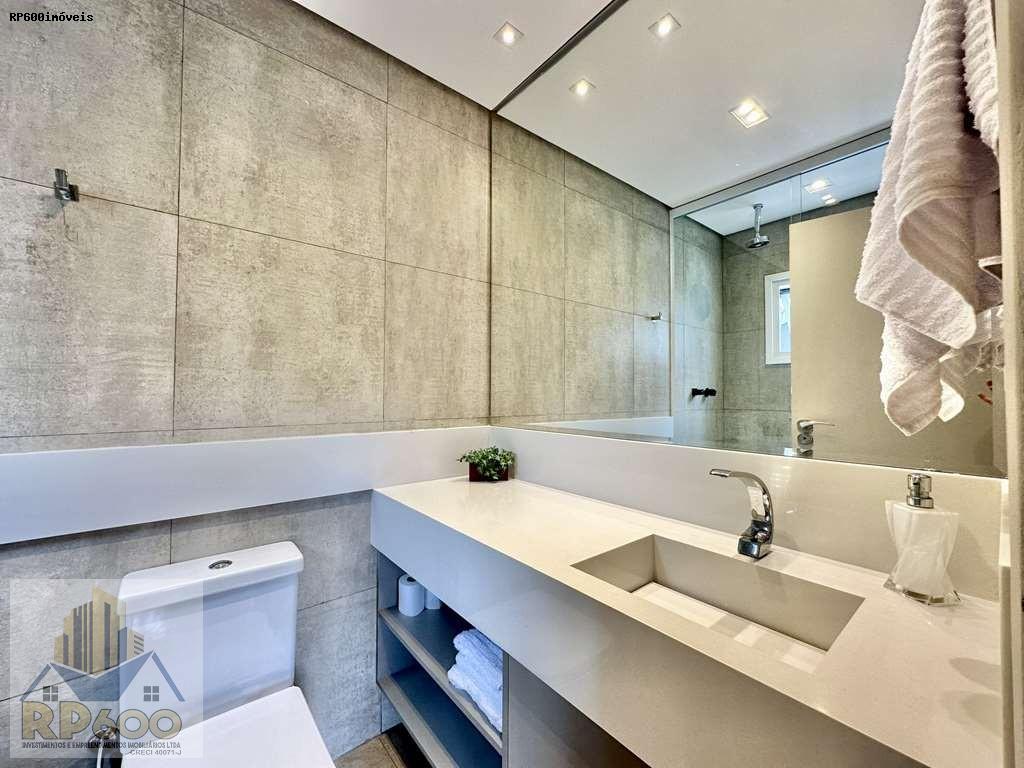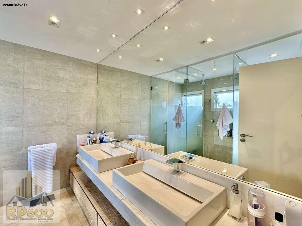 - Banheiros com espelhos, gabinetes com gavetões, bancada, box de vidro até o teto, nichos e chuveiros de teto. Sendo a master com tampo em mármore, 2 cubas, 2 duchas de teto e 2 vasos separados.