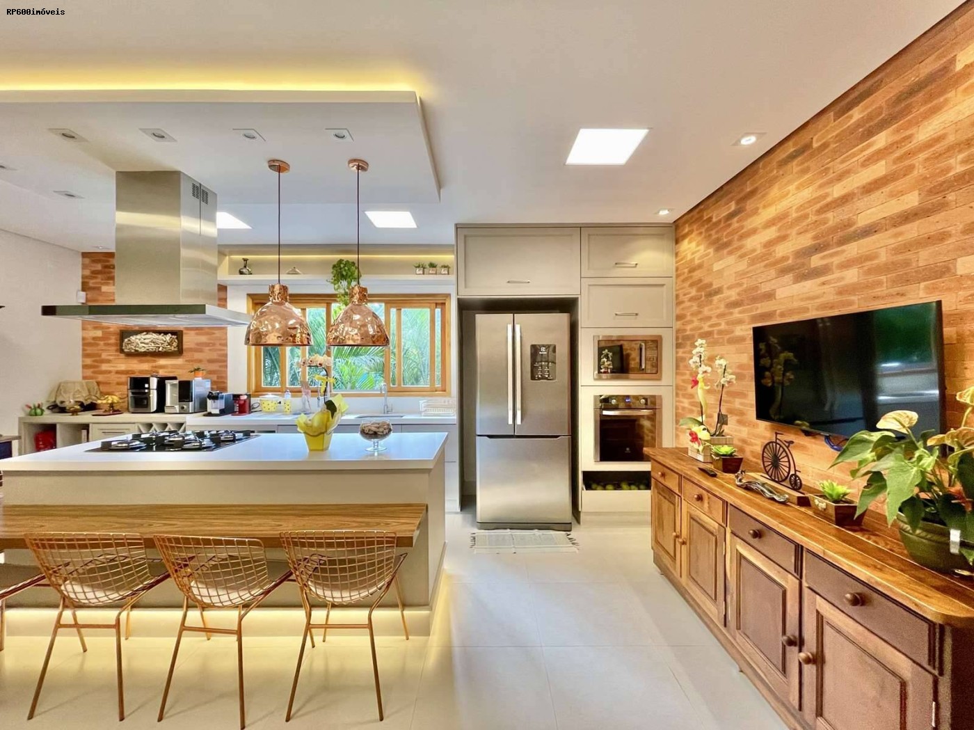 A casa dispõe de três suítes impecáveis, todas com armários planejados e banheiros de alto padrão, sendo a suíte master equipada com closet espaçoso e banheira de hidromassagem para momentos de puro relaxamento. São quatro banheiros bem distribuídos, lavabo elegante e um escritório que permite trabalhar em casa com total tranquilidade. A área social se destaca com um living de cinco ambientes, integrado à cozinha modernizada com ilha central, perfeita para receber convidados e desfrutar de refeições gourmet. A área de serviço aberta, lavanderia fechada e um depósito de 3.000 L complementam a praticidade do dia a dia.