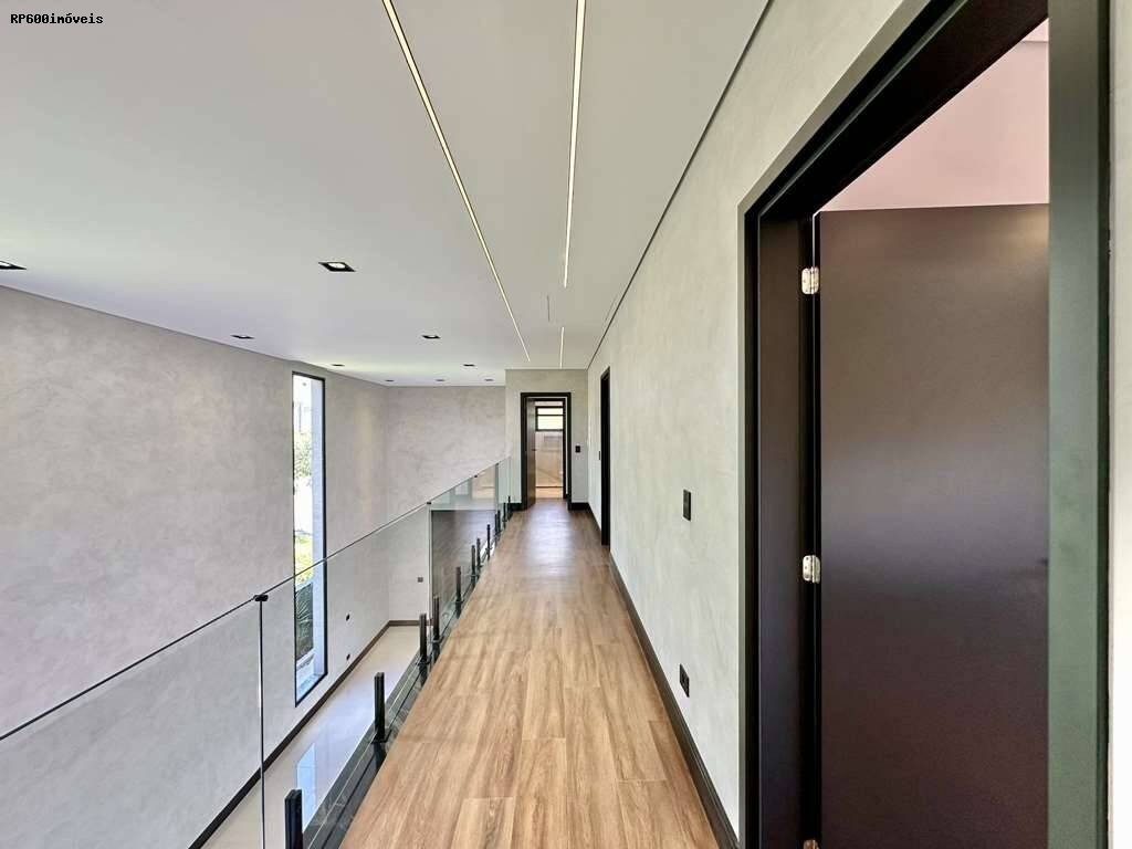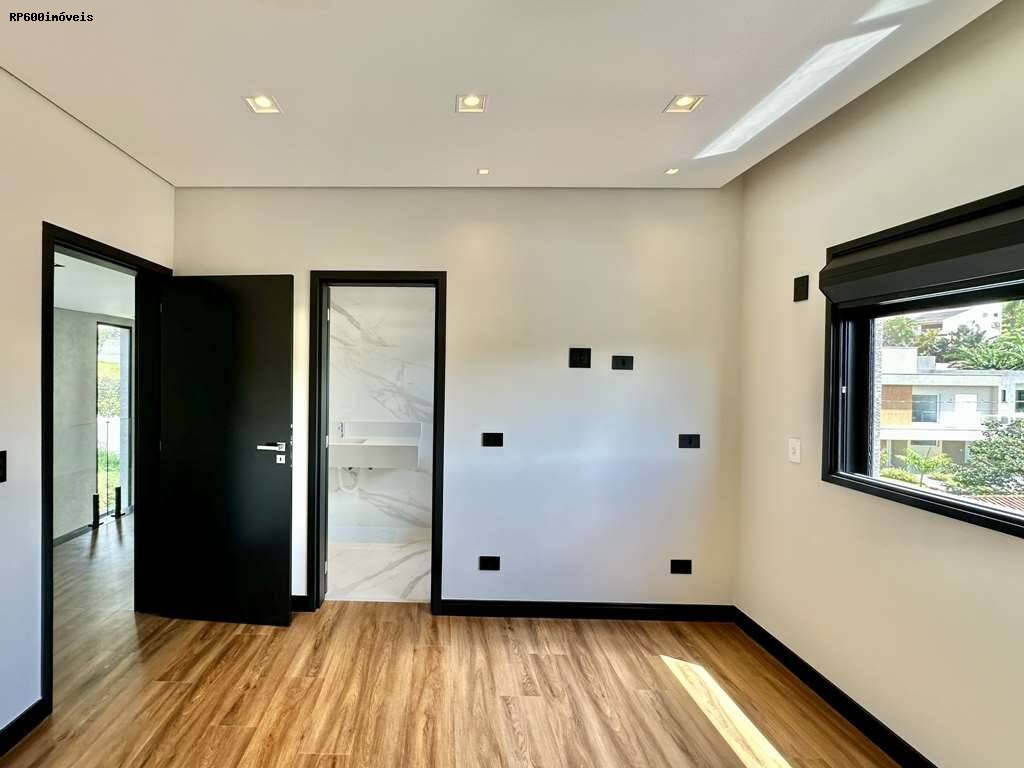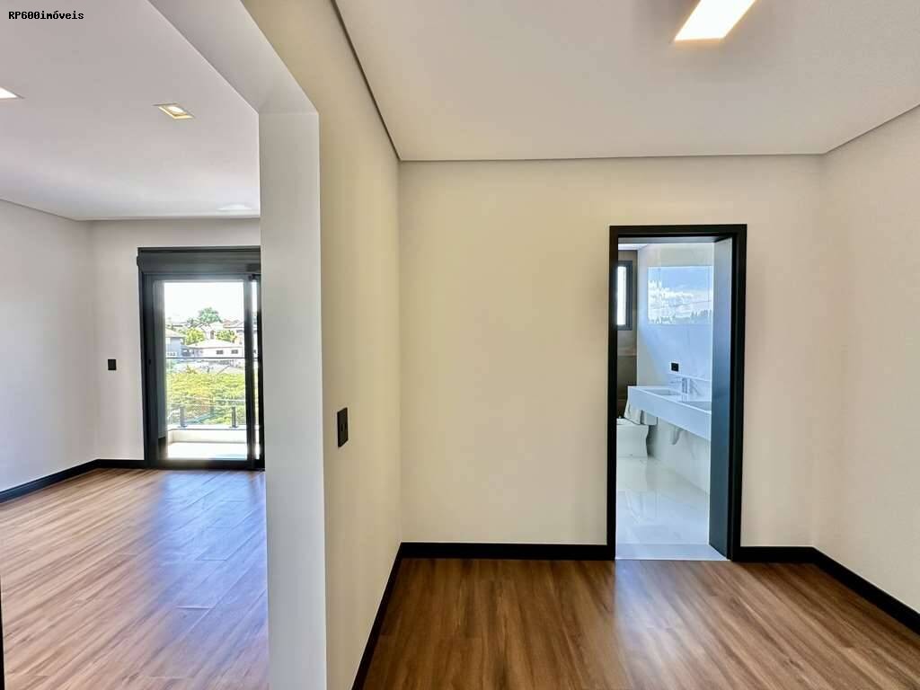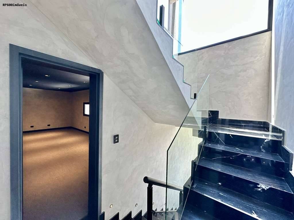 São quatro dormitórios, todos suítes, cada um com portas de alumínio preto, janelas de vidro e persianas elétricas, garantindo privacidade e praticidade. O master dispõe de um closet espaçoso e banheiro com acabamentos em mármore, proporcionando um refúgio de bem estar. A casa ainda conta com family room e salão multiuso, oferecendo flexibilidade para home office, academia ou salas de jogos.